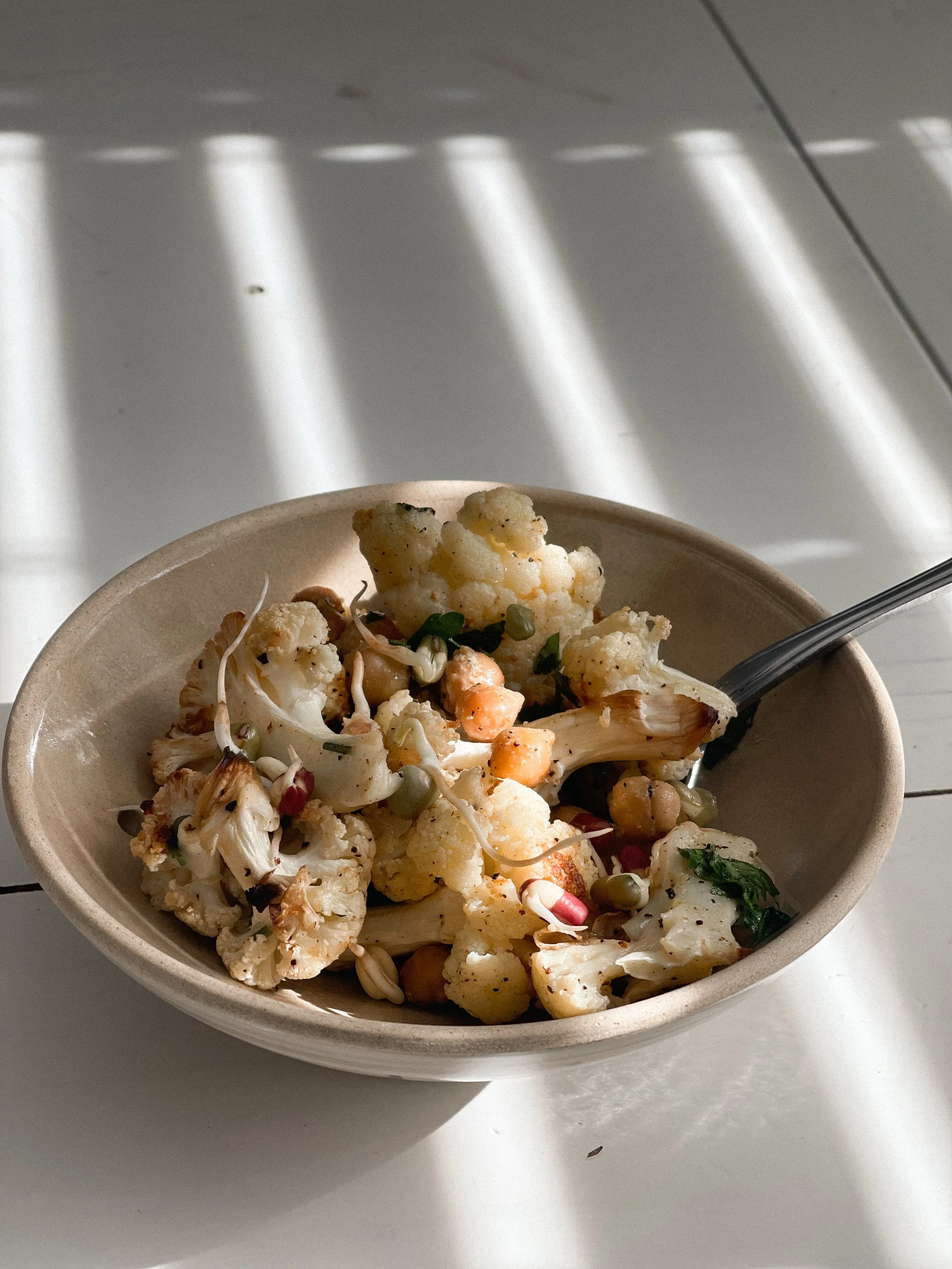 Roasted Cauliflower + Chickpeas with Parsley, Dijon, and Sprouts